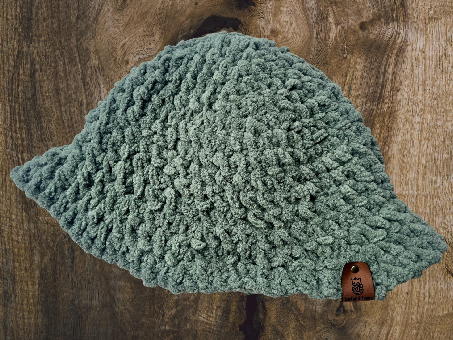 A crochet bucket hat made with soft, bulky chenille yarn. Unisex. This size fits most.