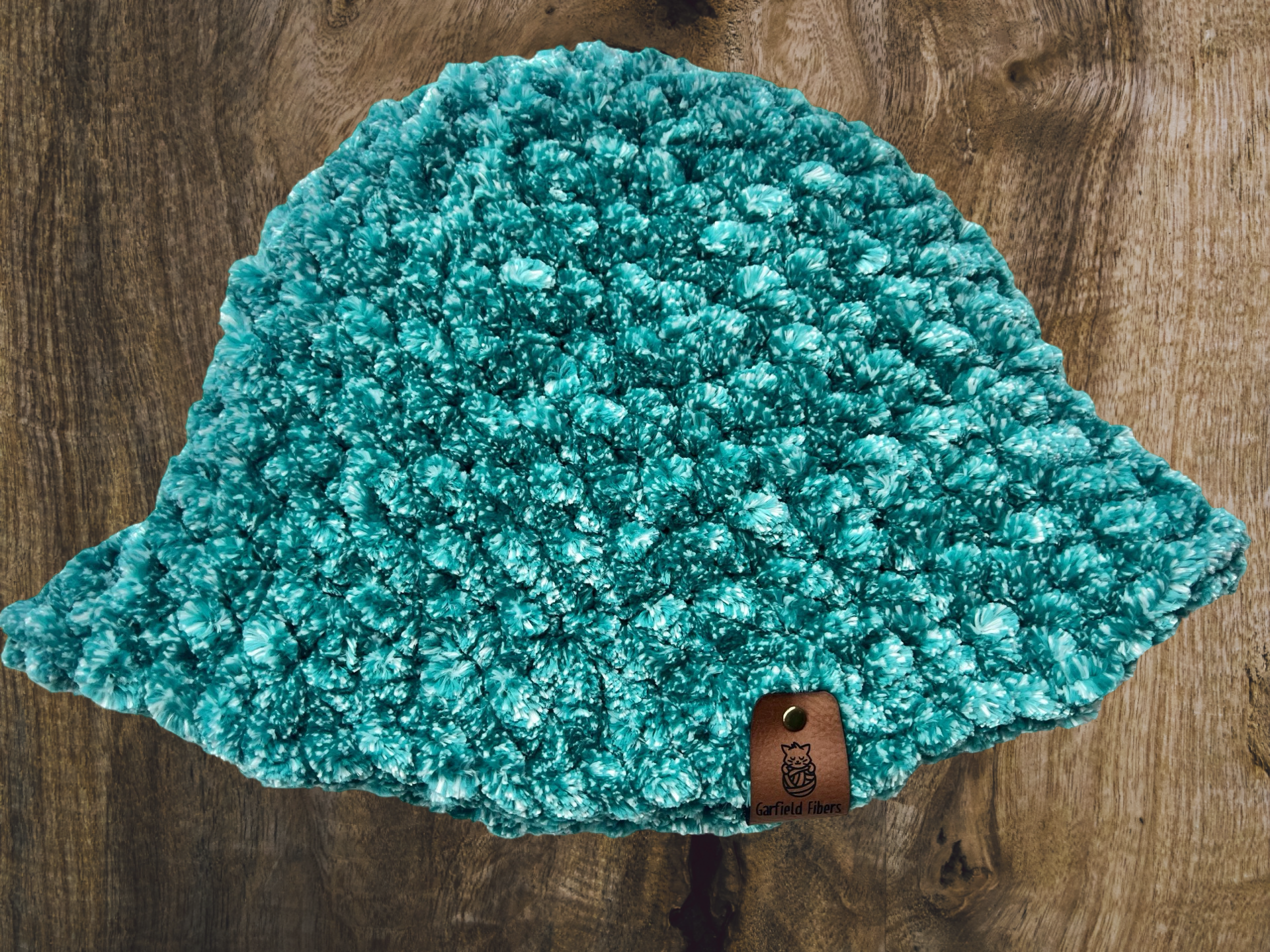 A crochet bucket hat made with soft, bulky velvet yarn. Unisex. This size fits most.